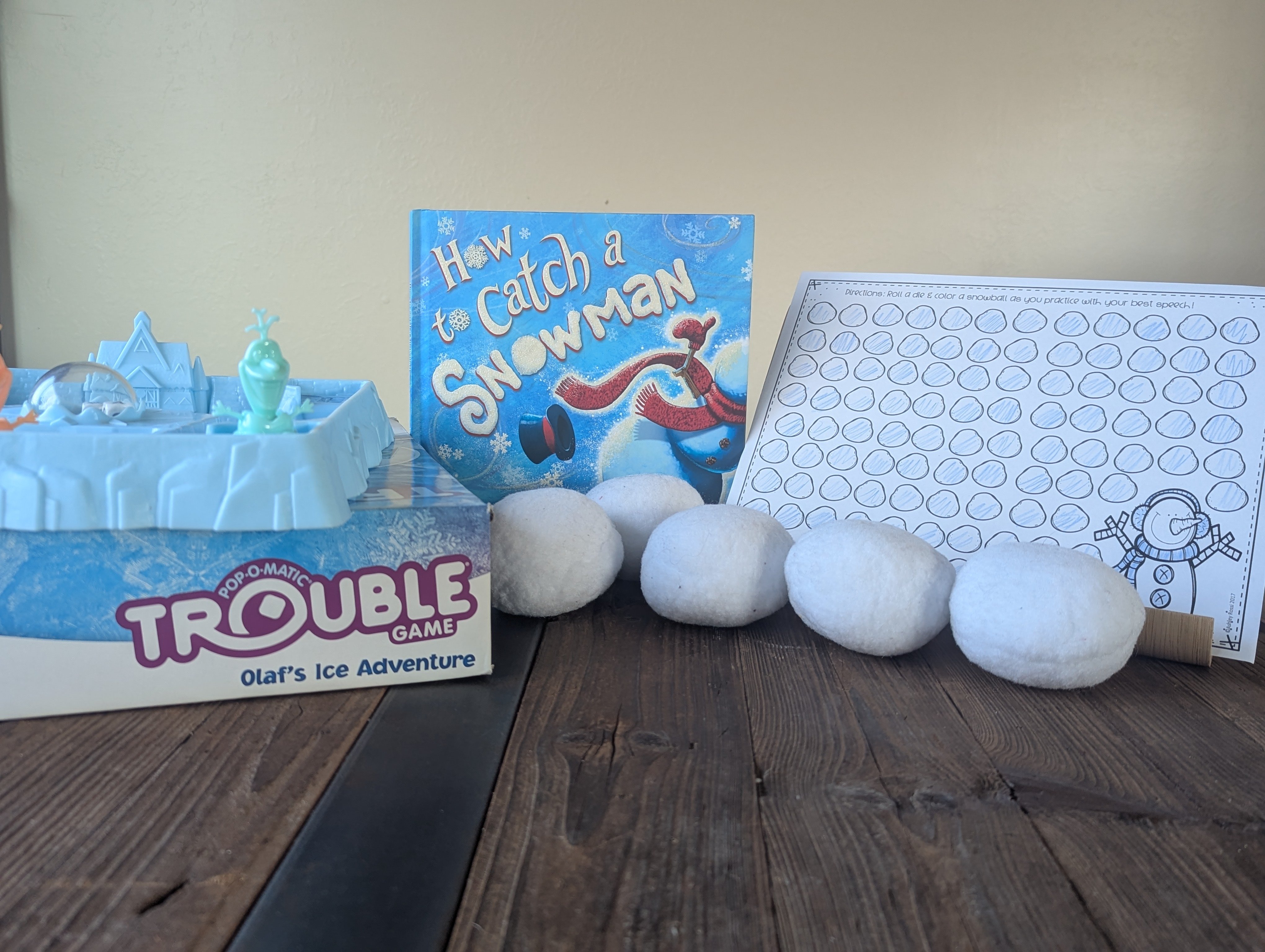 - Snowball Fight (I bought fake snowballs and have them try to hit numbers taped to the wall. An alternate idea is to have them try to knock over a tower of paper cups).